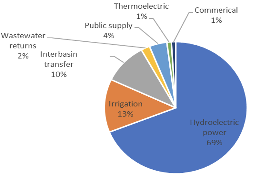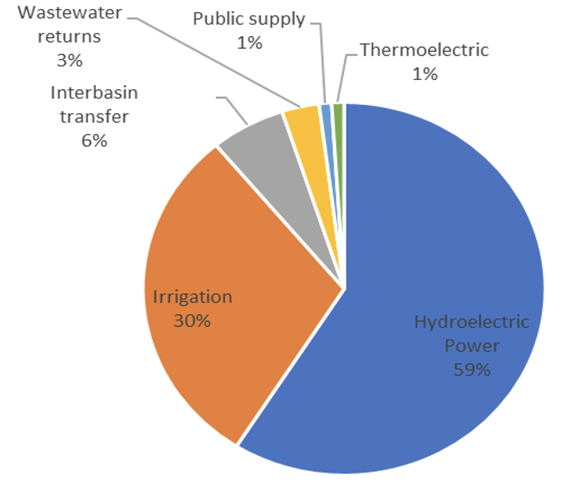 Where and how is the Colorado River used and wasted? The upper basin uses 59% for hydroelectric power, 30 % for irrigation, 6% inter basin transfer, 3% wastewater returns, 1% public supply, and 1% thermoelectric. For the lower basin, 69% hydroelectric, 13% irrigation, 10% inter basin transfer, 4% public supply, 2% wastewater returns, 1% commercial, and 1% thermoelectric. The Bureau of Reclamation states the Colorado compacts of 1922 allows seven states to use 7,500,000 acre-feet of the Colorado River, but they do not state how the water is to be divided among the basins. By 1948, five states: Arizona, Colorado, New Mexico, Utah, and Wyoming submitted an Upper Colorado River basin compact designed to designate how much water is promised to each state in the upper basin.